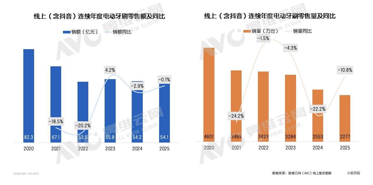 In 2025, the total online sales volume of electric toothbrushes in China was 22.77 million units, down 10.8% year-on-year; sales value reached 5.41 billion yuan, a slight decrease of 0.1% year-on-year.