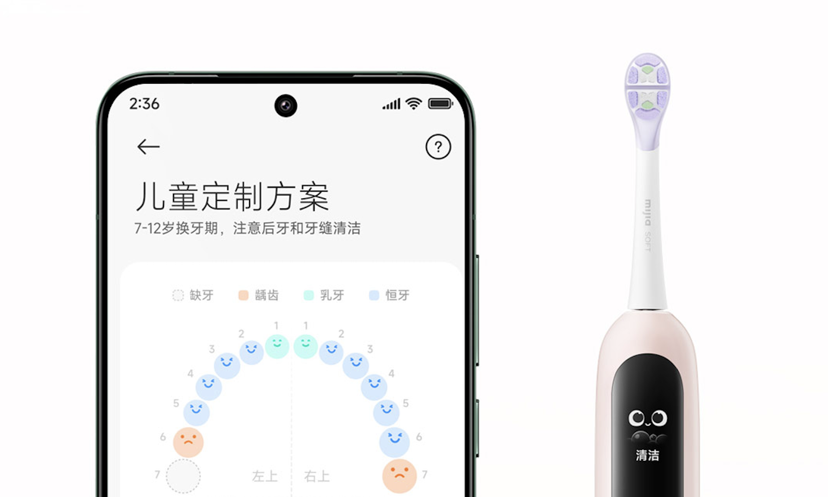 The AI algorithm is also applied to the Mijia App that pairs with the toothbrush. Parents can use the Mijia App to create a dental profile for their child, marking missing or decayed teeth, and the AI algorithm will customize a brushing plan for the marked areas. The Mijia App can also track brushing duration, coverage, and other data in real-time, generating a personalized brushing report for the child, allowing parents to monitor missed or inadequately brushed areas at any time.