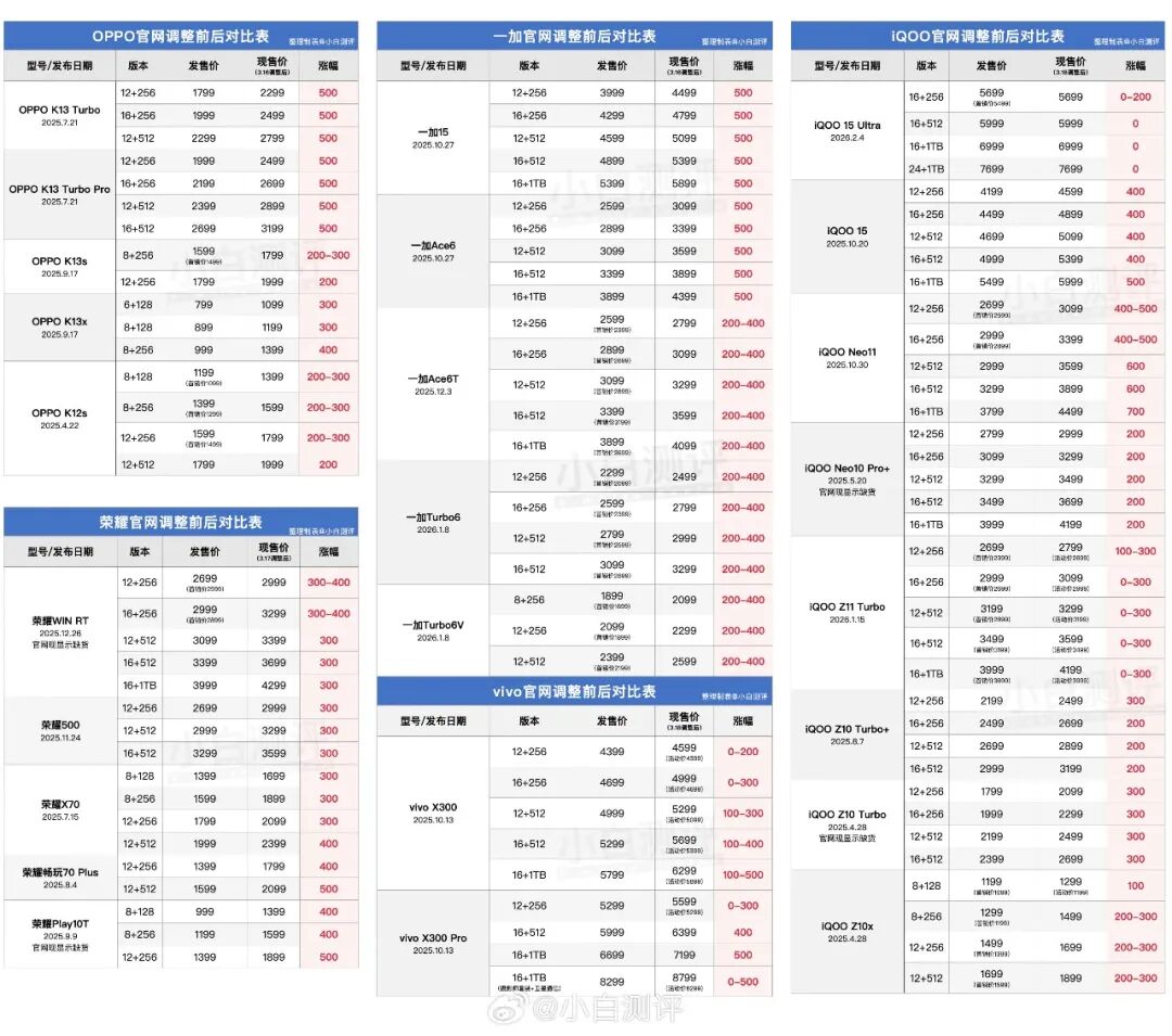 Faced with these relentless memory price hikes, smartphone giants such as OPPO, vivo, and Honor have responded by raising their product prices, with increases ranging from several hundred to over a thousand yuan.