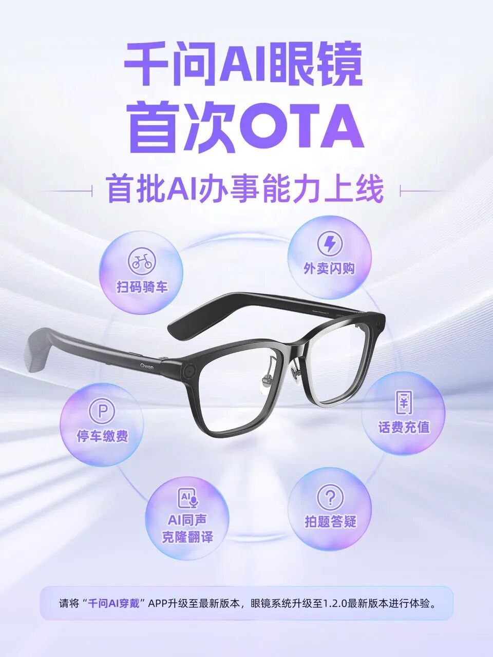 Qianwen AI glasses received their first OTA update this week, integrating with Taobao Flash Sales and Alipay to enable "AI-powered errands" such as mobile phone recharges, bike-sharing via QR codes, and parking fee payments, all operable through voice commands or "a glance."