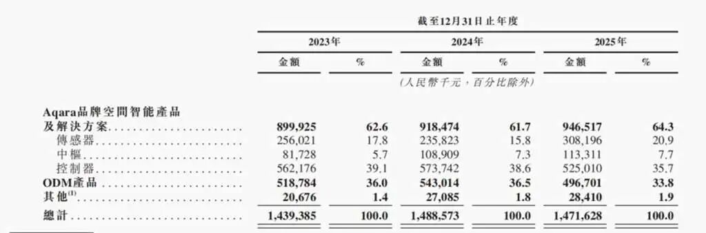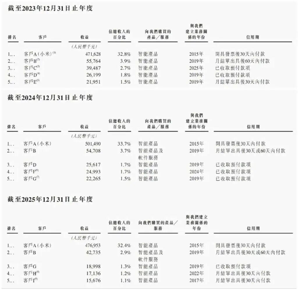 Xiaomi is Lumi's absolute single largest customer. From 2023 to 2025, Lumi's revenue from Xiaomi was 472 million, 501 million, and 477 million yuan, respectively, accounting for a stable 32.8%, 33.7%, and 32.4% of total annual revenue. This means nearly one-third of Lumi's lifeline is in Xiaomi's hands.