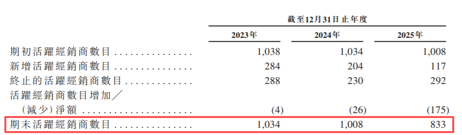 Whole-house smart homes are characterized by their "experience-heavy, delivery-heavy" nature. Lumi's offline service provider system was once its proud moat (pioneering the smart home 4S service system). However, data disclosed in the prospectus reveals troubling signals: Lumi's number of active dealers plummeted from 1,038 at the beginning of 2023 to 833 by the end of 2025. In 2025 alone, the net decrease in active dealers reached 175.