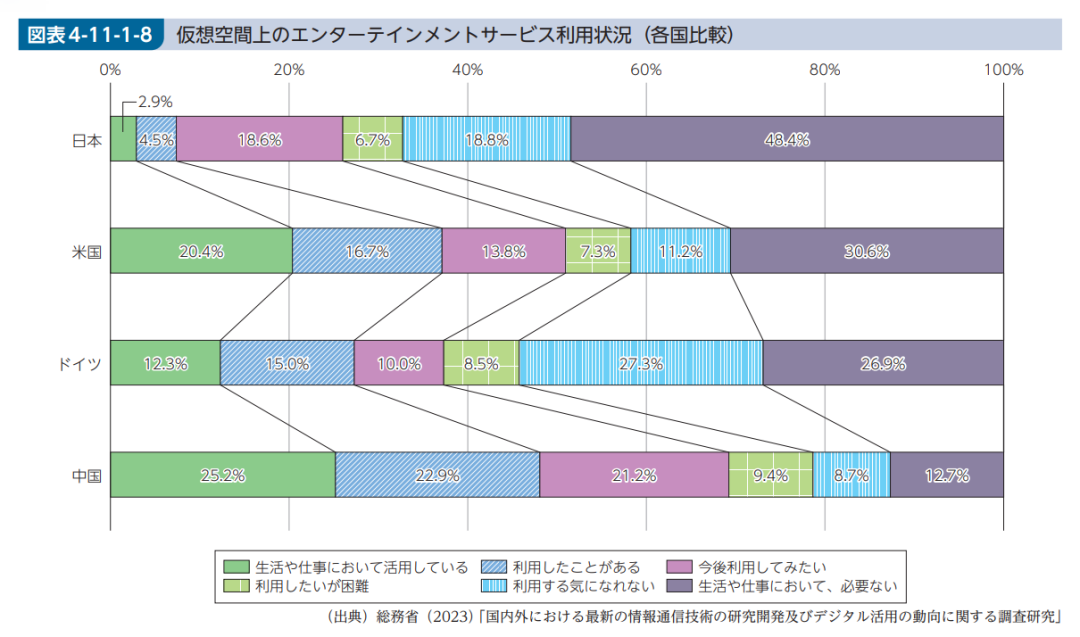 According to data released by Japan's Ministry of Internal Affairs and Communications in 2023, the proportion of the population that has used XR content is 20-30% in the United States and Germany, over 50% in China, but only 7.4% in Japan. Looking at usage by age group in Japan, people in their 20s have the highest usage rate (12.6%), and the proportion of those who 'want to use it in the future' is also highest among this group (30.6%). This data suggests that XR remains a non-essential experience form in Japan.