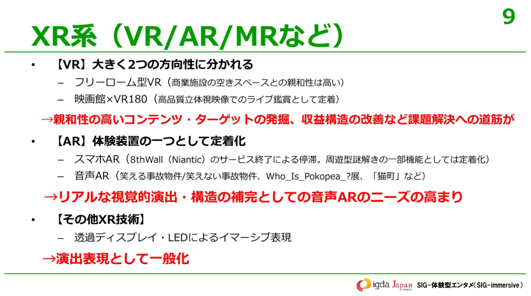 During the prolonged impact of the COVID-19 pandemic, people's entertainment activities shifted to their homes. Major manufacturers withdrew from the market, while some companies increased their use of virtual spaces not only for online events like virtual exhibitions and internal corporate activities but also for education and training, customer service, and online retail shopping experiences. Online entertainment and virtual socializing, primarily on platforms like VRChat, saw rapid growth. Coupled with collaborations with well-known IPs, this further intensified the demand for 'content expressiveness' and 'sensory immersion' in Japan's XR offline experiences.