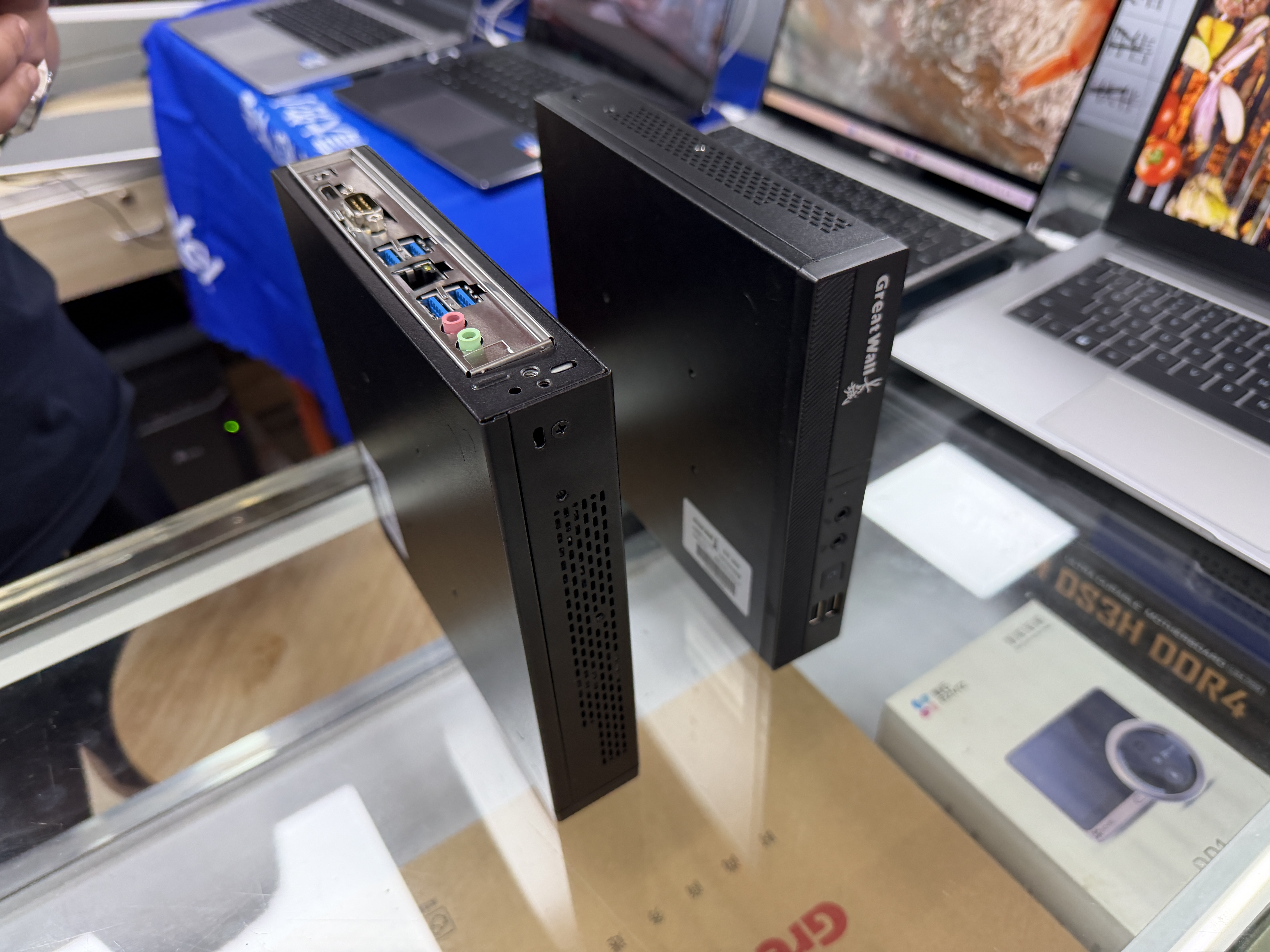 This store's counter displayed two Great Wall mini host models, both 'barebone' systems requiring users to add CPU, memory, hard drive, and install an operating system: