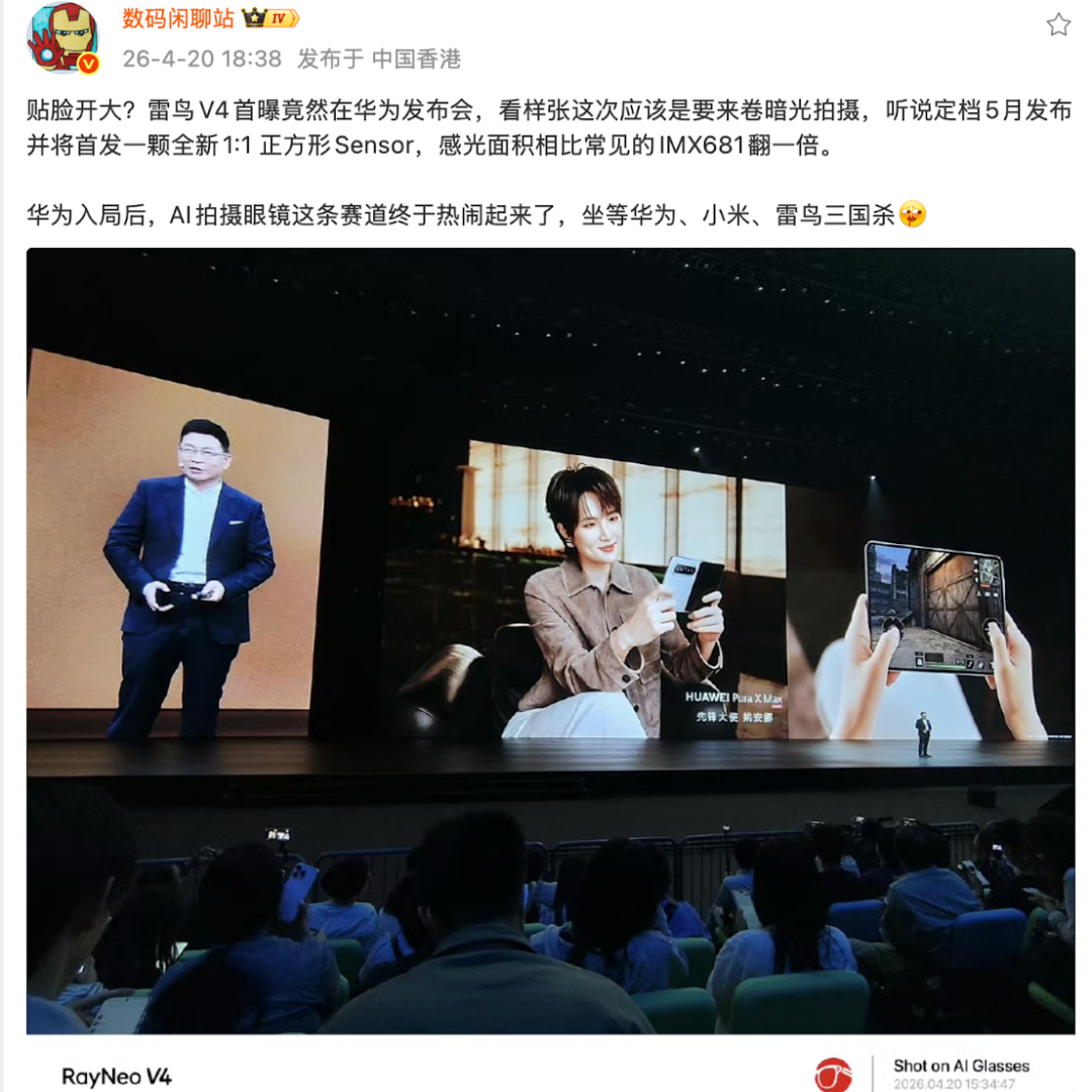 This marks Huawei’s first flagship hardware entry in the XR sector during the AI large model era. Interestingly, just a week prior to Huawei’s announcement, design sketches of Apple’s AI glasses surfaced, while domestic AI glasses frontrunner Thunderbird Innovation revealed plans to launch its next-gen AI photography glasses, the Thunderbird V4, next month. With tech giants stepping into the arena and startups accelerating their pace, the entire AI glasses industry is rapidly entering a high-growth phase.