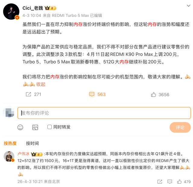 However, this is not entirely by choice for manufacturers. Not long ago, Wei Siqi, General Manager of Xiaomi's China Marketing Department, stated on her personal Weibo account that the company had already taken various measures to offset the terminal pricing pressure caused by rising memory prices. However, the magnitude and persistence of this round of memory price increases far exceeded the company's initial projections and are now beyond controllable limits.