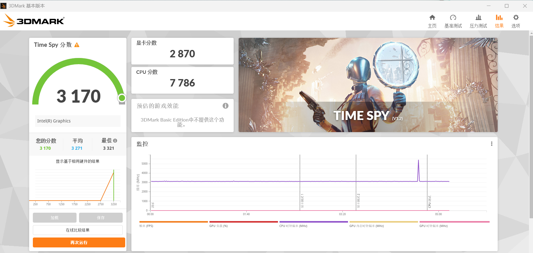 In the 3DMark Time Spy scenario test, the integrated graphics scored 3,170 points.
