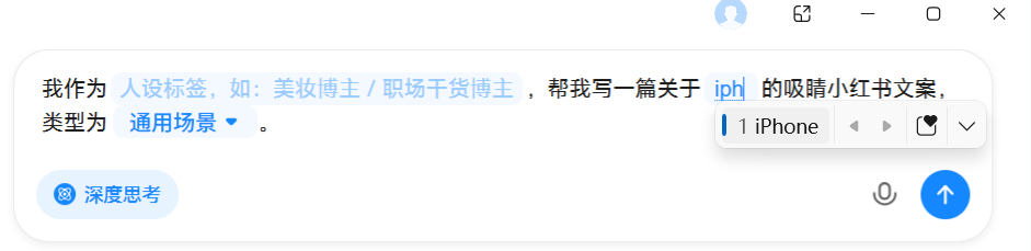 For example, if I want to write a promotional copy for an iPhone case on Xiaohongshu (Little Red Book) but lack ideas, I can open an agent in YOYO. After clicking on it, it generates a prompt template. I just need to fill in a few keywords, and it inputs this prompt to the AI model to generate a copy that fits the Xiaohongshu style.