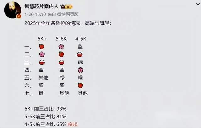 Similarly, Xiaomi, ranked fourth by IDC in 2025, has seen its flagship models gain momentum from its automotive business, with the Xiaomi 14, 15, and 17 series performing well. However, it still trails Apple and Huawei. According to CNMO Technology, citing a tech blogger's leaks, Apple dominates the 6,000 RMB+ ultra-premium segment with 93% market share, followed by Huawei and Xiaomi. In the 4,000–5,000 RMB range, competition is more dispersed, led by Vivo, Xiaomi, and OPPO, who collectively hold 65% share.