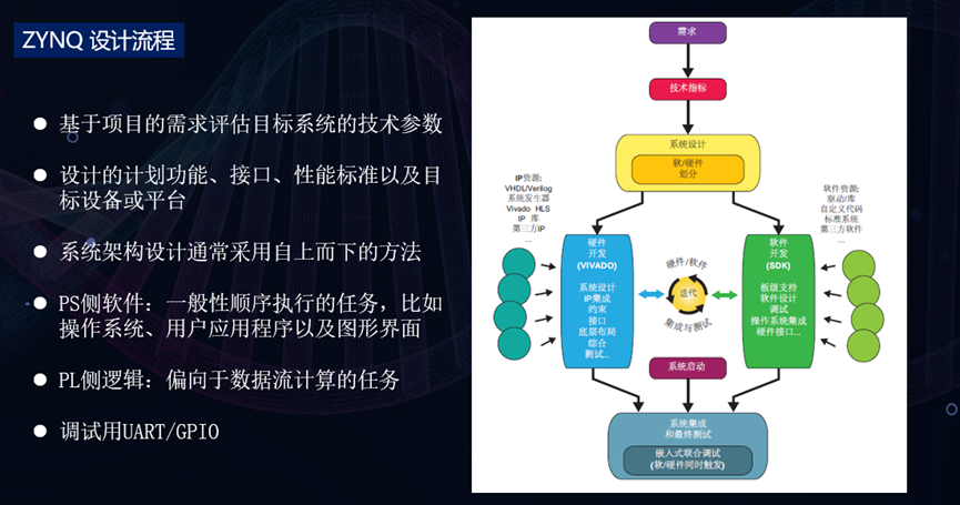 In summary, the design flow of ZYNQ is shown in the following diagram, with the PS side responsible for software development and the PL side responsible for logic development, followed by joint debugging.