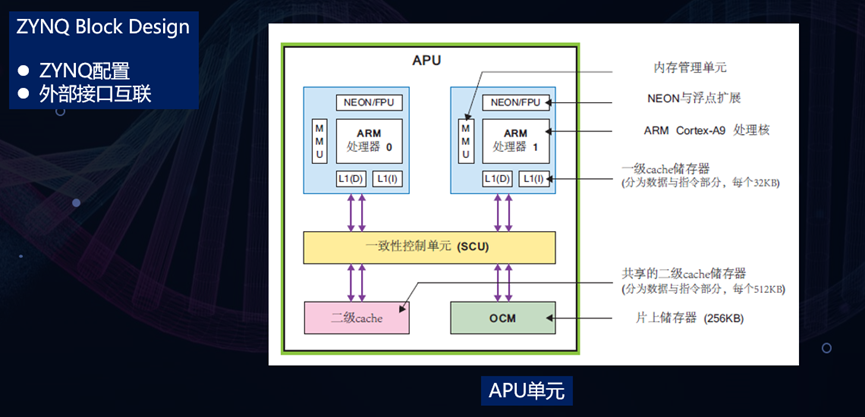 The APU is primarily composed of two ARM processing cores, each associated with several computable units: a NEONTM Media Processing Engine (MPE) and Floating Point Unit (FPU); a Memory Management Unit (MMU); and a Level 1 cache memory (divided into instruction and data sections). The APU also includes a Level 2 cache memory, followed by On-Chip Memory (OCM). Finally, a Snoop Control Unit (SCU) forms a bridge connection between the ARM cores, Level 2 cache, and OCM memory. This unit is also partially responsible for interfacing with the PL, although this interface is not indicated in the diagram.
