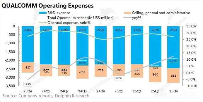 Since the company's profit is affected by tax adjustments, core operating profit is more valuable. Qualcomm's core operating profit for the quarter was $3.37 billion, down 5% year-over-year, with a core operating profit margin of 27.5%. The decline in profit this quarter was mainly due to the decline in gross margin and the increase in expenses.
