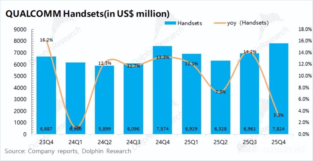 For the slowdown in the company's smartphone business growth this quarter, Dolphin Research believes there are two main reasons: ① The company brought forward the release of its flagship product, the Snapdragon 8 Elite Gen5, to the previous quarter. ② The overall industry performance of the smartphone market was sluggish.