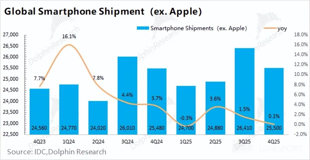 Combining industry data, under the influence of Apple's new phone strategy of "more features at the same price," smartphone shipments (excluding Apple) in the fourth quarter of 2025 were 255 million units, basically flat year-over-year, indicating a rather sluggish Android market.
