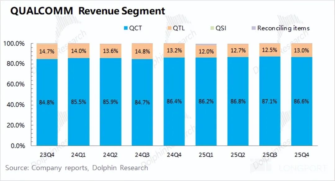 2. Business Segment Performance: Qualcomm's operations are mainly divided into two segments: semiconductor chip business (QCT) and technology licensing business (QTL), with the semiconductor chip business being the primary revenue contributor, accounting for nearly 90%.