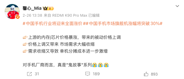 On February 26, 2026, REDMI Product Manager Hu Xinxin posted on social media that soaring upstream memory and chip prices had forced phone prices to rise passively. This price increase led to a significant contraction in demand, which, in turn, caused per-unit cost allocation to surge further. "For phone manufacturers, it's truly a 'horror story' series."