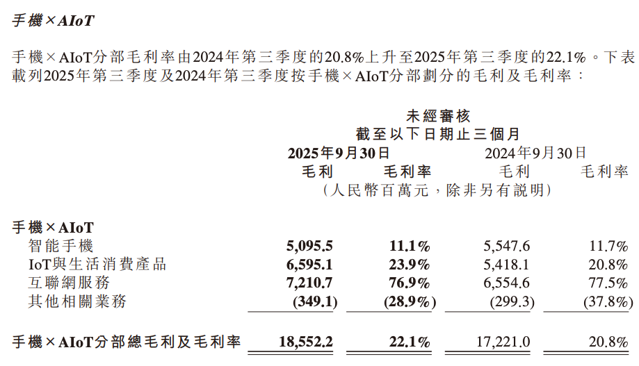 Take Xiaomi as an example. Although it is a smartphone manufacturer, its primary revenue comes from internet services. Financial reports show that in Q3 2025, Xiaomi's internet services had a gross profit margin of 76.9%, generating 7.211 billion RMB in gross profit—accounting for 38.87% of the total gross profit of the Mobile × AIoT division, far exceeding the smartphone business.