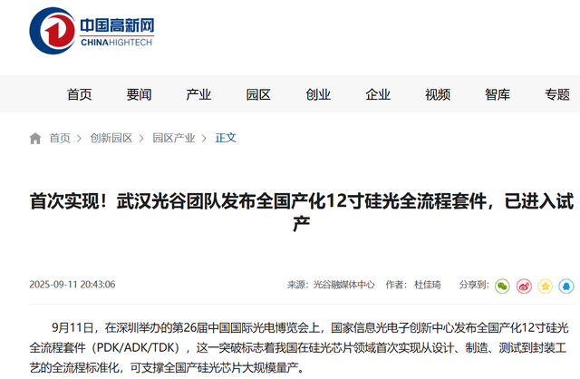 In September 2024, the National Information Optoelectronics Innovation Center released a fully localized 12-inch silicon photonics full-process kit (PDK/ADK/TDK), achieving full-process standardization from design to packaging for the first time and paving the way for large-scale production.