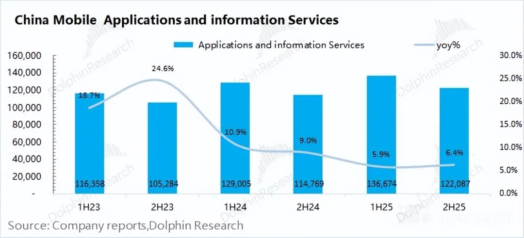 a) Data Traffic Business: The largest revenue contributor, accounting for 40% of total revenue. Data traffic revenue in the second half of 2025 was RMB 173.6 billion, down 4% year-on-year. Despite a 10% increase in data usage volume, the average data tariff dropped by 13% as the company continued its strategy of reducing fees to attract users.