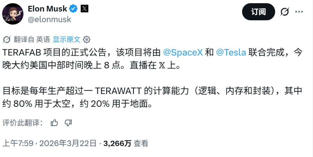 March 21: Musk announced the Terafab plan—a joint venture by Tesla, SpaceX, and xAI to build the world’s largest chip manufacturing facility in Austin, Texas, targeting annual production of 1 terawatt (1TW) of AI computing power, roughly half of the current global total capacity.