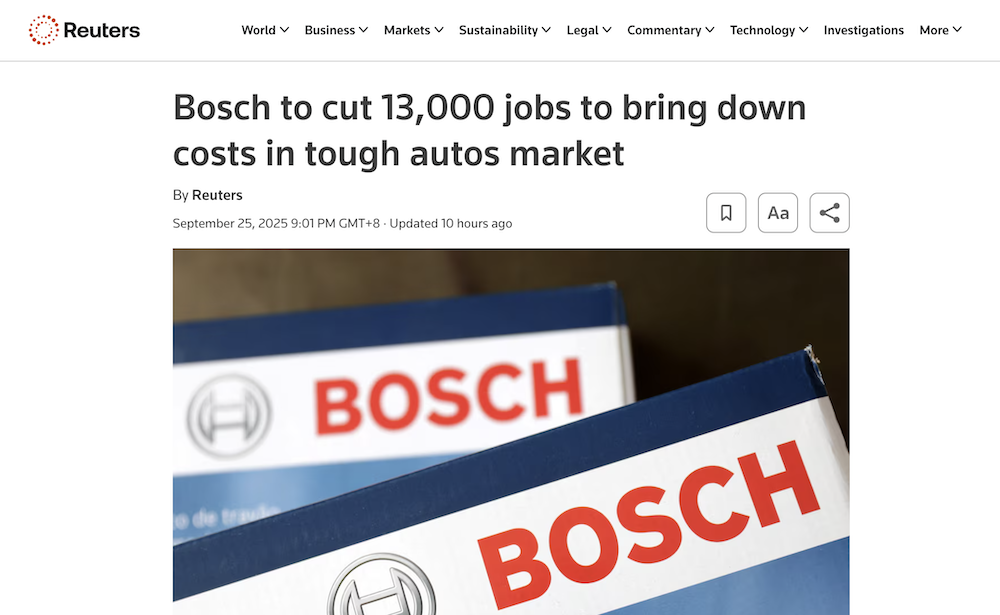 For example, Continental AG announced in February that it plans to cut about 3,000 jobs by the end of 2026. Prior to this, Continental had already conducted multiple rounds of layoffs, totaling over 10,000 jobs.