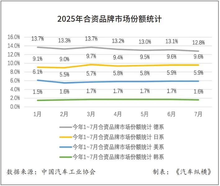 According to statistical data from the CAAM, in the first seven months of this year, the cumulative market share of domestic joint venture passenger cars has remained consistently above 31% (except for February at 30.6%) and has not shown a gradual decline. Among them, the market share of German brand passenger cars has hovered around 13%, Japanese brands have exceeded 9%, American brands have approached 6%, and Korean brands have stabilized at over 1.5%.