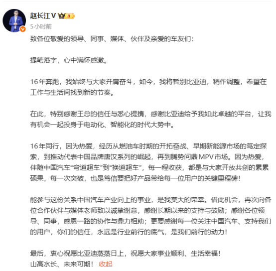 "Over the past 16 years, I've stood shoulder to shoulder with everyone, relentlessly pursuing our goals. Now, I'm taking a brief hiatus from BYD to recalibrate, seeking a fresh balance between my professional and personal life."
