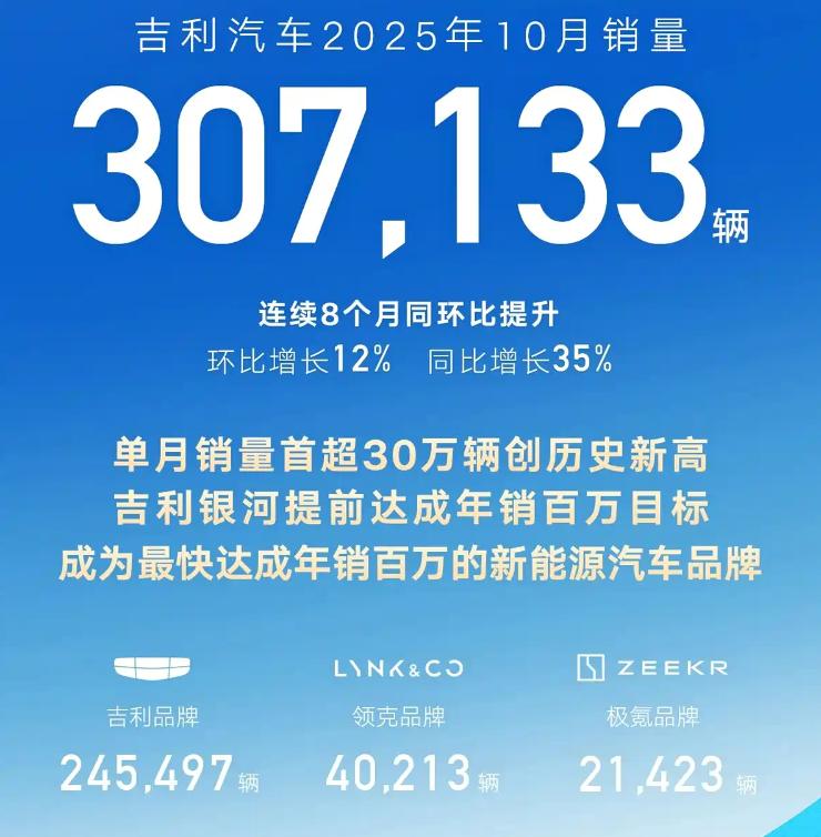 Geely Auto performed exceptionally well, with October sales exceeding 300,000 units for the first time, reaching 307,133 units, a 35% year-on-year increase. It has achieved year-on-year and month-on-month growth for eight consecutive months.