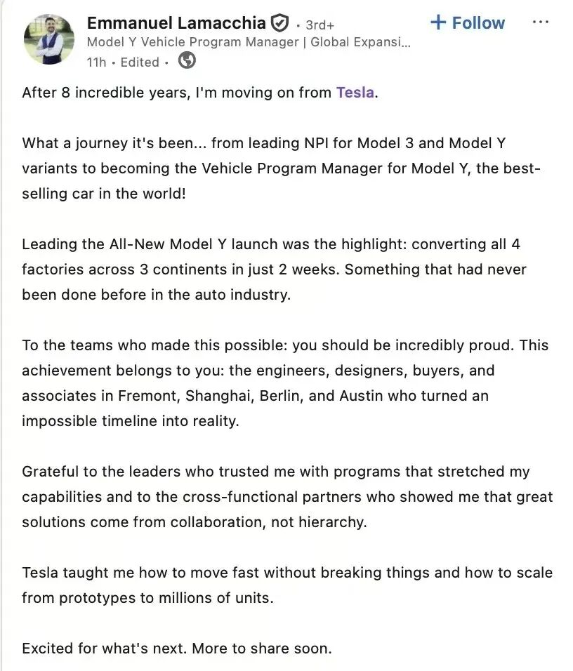Just hours after Awasthi's resignation announcement, Emmanuel Lamacchia, the project manager for Tesla's best-selling Model Y, officially tendered his resignation.