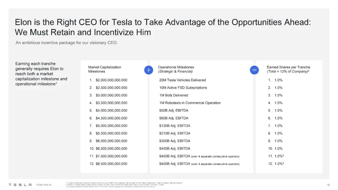 The revised plan is structured into 12 tranches. Each tranche represents roughly 1% of the total shares and will only be awarded upon the attainment of both market capitalization and operational milestones.