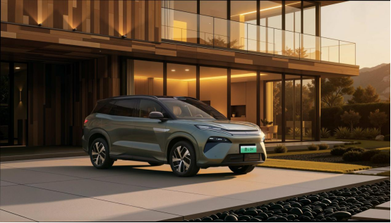 The olive green features a low-saturation, high-reflectivity metallic paint finish, achieved through a precise blend of nanoscale high-transparency pigment and micron-scale ultra-fine aluminum powder, creating a gradient effect of green with hints of gold. It presents a fresh and bright visual effect in sunlight and transitions to a deep, rich green indoors, perfectly aligning with contemporary elites' lifestyle attitude of "vitality hidden in tranquility." Additionally, the Tang L complements the olive green with a floating black roof, enhancing visual tension. The black roof contrasts sharply with the body, creating a "floating" visual effect that enhances the vehicle's layered appearance and sporty style.