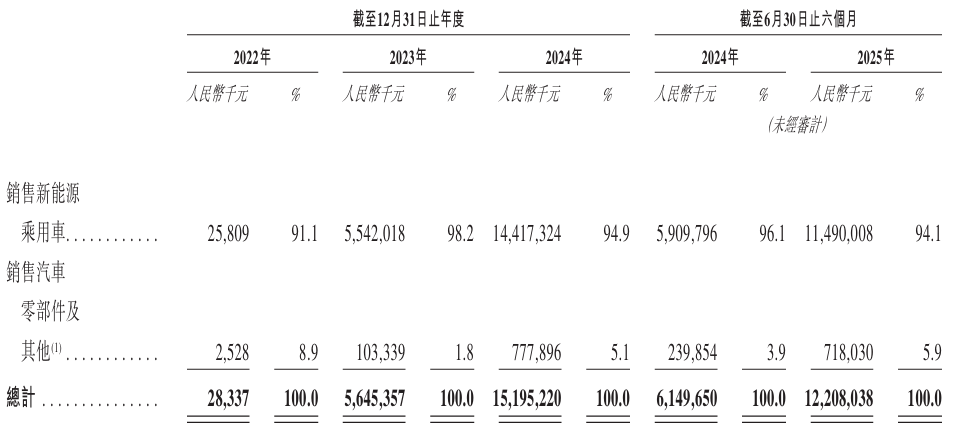 Regarding revenue by business segment, sales of new energy passenger vehicles increased from RMB 5.542 billion in 2023, accounting for 98.2%, to RMB 14.417 billion in 2024, accounting for 94.9%. In the first half of 2025, it was RMB 11.490 billion, accounting for 94.1%, representing the core revenue stream.