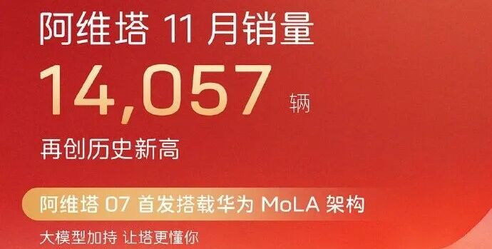 Avatr set a new sales record with 14,057 units sold in November. Similar to Voyah, Avatr's sales growth is mainly due to its deep integration with Huawei, with multiple models equipped with Huawei's intelligent driving system.
