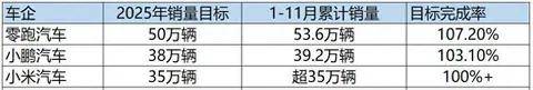 Leapmotor has sold a cumulative 536,000 units from January to November, achieving 107% of its full-year sales target of 500,000 units. Xiaomi Motors has delivered over 355,000 units in the first 11 months, exceeding its 350,000-unit target ahead of time. XPeng Motors has delivered a cumulative 392,000 units from January to November, not only surpassing its 350,000-unit annual target but also achieving a year-on-year growth rate of 156%.