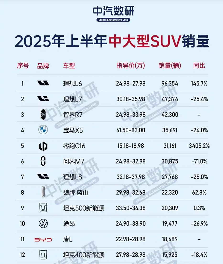 In contrast, many self-owned new energy brands have already achieved brand elevation through continuous technological innovation. Taking the mid-to-large SUV segment where the Ford Fun Bronco competes, data from China Automotive Data Research Institute shows that in the first half of 2025, the Li Auto L6 and L7 claimed the top two spots with total sales of 96,354 and 47,374 units, respectively.