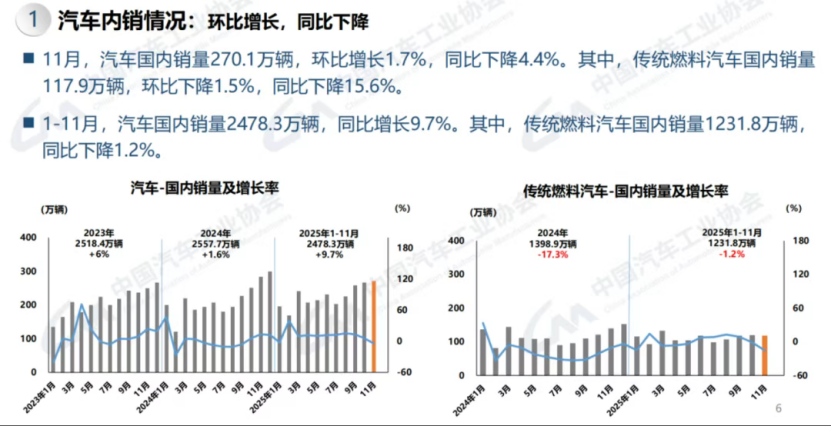 CAAM data indicates that in November, automobile production and sales volumes reached 3.532 million units and 3.429 million units, respectively, marking a 5.1% and 3.2% increase month-on-month and a 2.8% and 3.4% rise year-on-year, continuing an upward trend. For the first 11 months, cumulative production and sales stood at 31.231 million units and 31.127 million units, respectively, showing an 11.9% and 11.4% year-on-year increase.