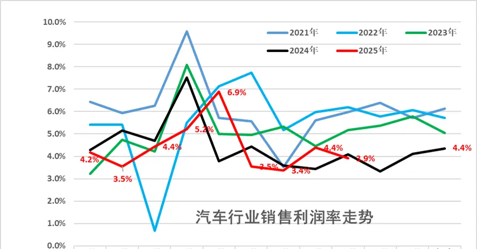 According to data from Cui Dongshu, Secretary-General of the China Passenger Car Association, the sales profit margin of the automotive industry from January to October was only 4.4%. Although slightly warmer than the same period in 2024, it still hovered at a five-year low, below the average profit margin of 6% for downstream industrial enterprises. The sales profit margin for October alone plummeted to 3.9%.