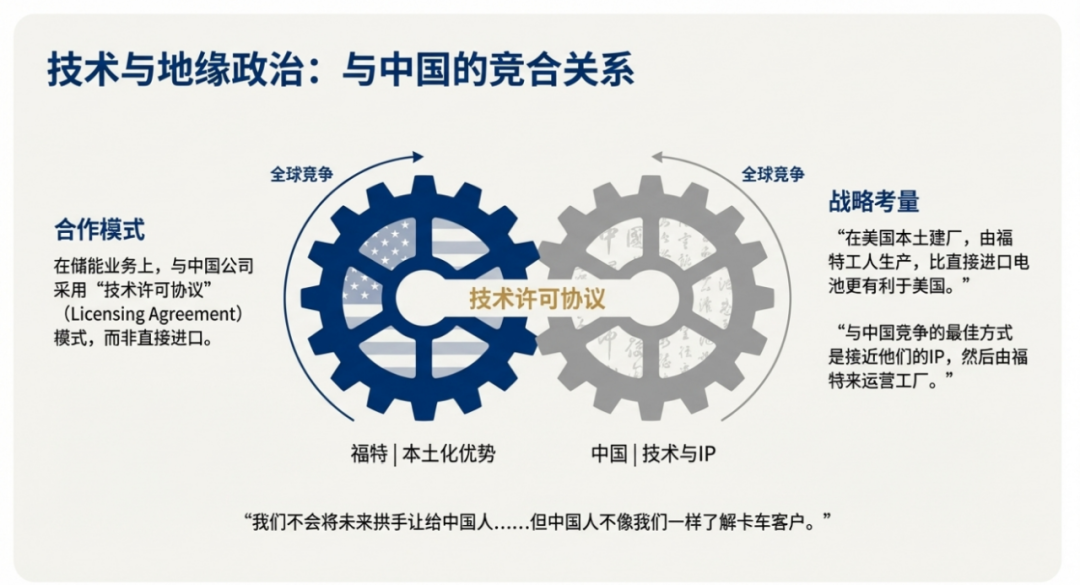 When engaging with Chinese enterprises, Ford has adopted a 'technology licensing + local manufacturing' approach. Ford insists on constructing battery factories and operating production lines in the U.S. with American labor, believing this to be the optimal method for mastering core intellectual property (IP) and competing with Chinese manufacturers. Farley contends that by remaining proximate to the technology source and leveraging Ford's robust manufacturing capabilities, the company can gain a competitive advantage over merely importing batteries, while simultaneously creating thousands of U.S. jobs.