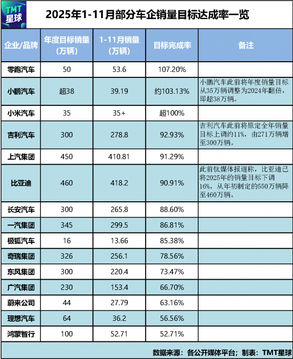 As 2025 nears its end, the completion status of annual sales targets for major automakers gradually becomes clear, with significant differentiation among different camps. Some automakers have already “crossed the finish line,” while others are still sprinting with all their might, and some have basically determined they will not meet their targets.