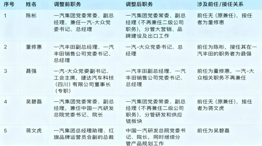 Additionally, as part of this coordinated effort, Nie Qiang, the former Chairman of the FAW-Volkswagen Labor Union, quickly transitioned to FAW Toyota to fill a leadership gap. This series of interconnected moves involving six senior executives precisely covers the two most vital joint venture pillars within the group. Beyond these three, the roles of three other executives—Wu Bilei, Jiang Wenhu, and Liu Changqing—were also adjusted simultaneously.