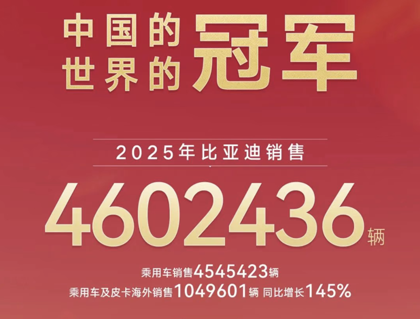 Data shows that BYD sold a total of 4,602,436 vehicles in 2025, up 8% year-on-year, successfully achieving its annual target. This remarkable performance secured BYD the titles of China's automotive market sales champion, China's automotive brand sales champion, and global new energy vehicle market sales champion.