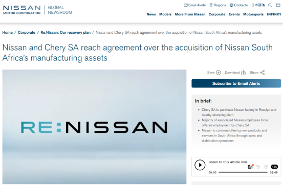 On January 23, Nissan Motor disclosed that it had inked a deal with Chery South Africa. Under this agreement, Chery will take over Nissan's manufacturing facilities in Rosslyn, South Africa. This encompasses the factory itself (along with the adjacent stamping workshop), the land, the buildings, and all associated assets. The transaction is anticipated to be finalized by mid-2026, contingent upon the fulfillment of certain conditions, including obtaining regulatory approvals.