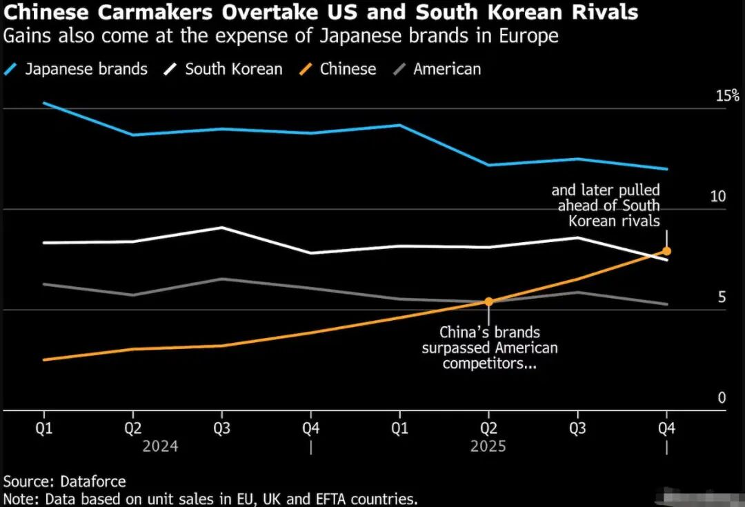 Non-European brands with decades of European operations and mature dealership networks are now feeling competitive pressure from Chinese automakers. Dataforce shows Chinese brands surpassed U.S. automakers in European sales during Q2 2025 and overtook South Korean companies in Q4.