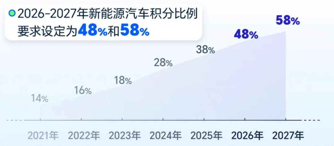 At the same time, at the policy level, the 'Evaluation Methods and Indicators for Passenger Vehicle Fuel Consumption' implemented in 2026 is known as the 'strictest fuel consumption standard.' Through differentiated assessments and full-cycle supervision, it compels automakers to accelerate their new energy transitions. In 2026, automakers' new energy credit ratios must reach 48%, rising to 58% in 2027, further reinforcing the development orientation of new energy.