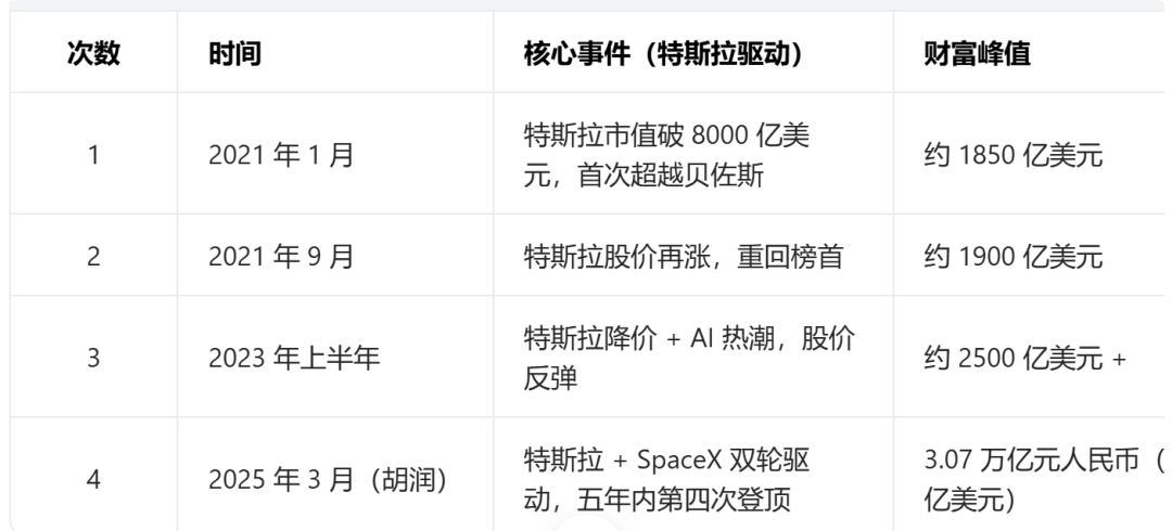 At that time, Musk poured nearly all his heart and soul into Tesla. Tesla has indeed justified Musk's efforts. According to mainstream billionaire rankings, Musk topped the global rich list four times thanks to Tesla, all between 2021 and 2025. Around 70-80% of his wealth comes from Tesla stock, with each peak driven by Tesla's soaring stock price. For instance, in November 2021, Musk became the first person worldwide with a net worth exceeding $300 billion, primarily due to Tesla's market cap surpassing $1 trillion.