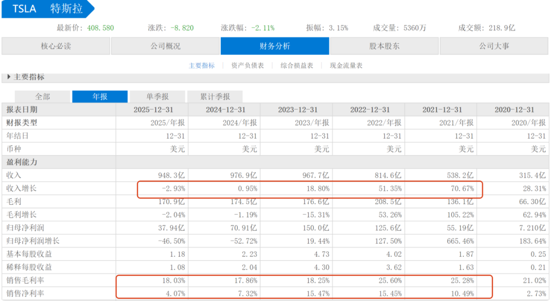 Tesla's 2025 revenue was $94.83 billion, down 2.9% year-on-year, with net profit at $3.794 billion, down 46.5%. Net profit nearly halved. Notably, Tesla's revenue growth has significantly slowed, from 70.67% in 2021 to 51.35% in 2022, 18.8% in 2023, and 0.95% in 2024, before declining 2.9% in 2025. Net profit growth followed a similar trend, surging 665.46% in 2021 and 127.5% in 2022, but dropping to 19.44% in 2023 due to price wars, then plummeting 52.72% in 2024, with net profit falling from $15 billion in 2023 to $3.794 billion.