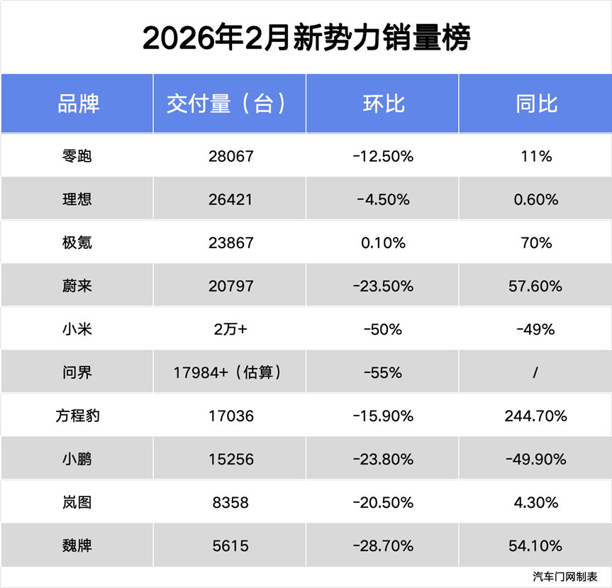 Leapmotor delivered 28,067 units in February, experiencing a 12.5% month-on-month decline but a 11% year-on-year increase, securing the top spot in new forces sales. While the month-on-month drop may seem notable, Leapmotor's sales fluctuation in February was relatively modest compared to its 46.9% month-on-month decline in January 2026, when sales nearly halved. This was influenced not only by the reduction in purchase tax subsidies but also by aggressive pre-holiday promotions by many automakers that depleted sales.