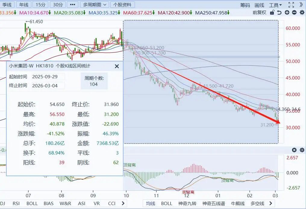 Calculating from last June's peak stock price of HK$61.45 per share and the March 4 closing price of HK$32 per share, Xiaomi Group's stock price has seen a maximum retracement of 48% over the past year, "nearly halving." Based on the placement price of HK$53.25, investors' paper losses have approached 40%.
