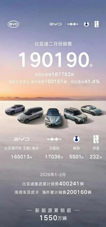 In recent years, BYD has dominated the global NEV race, leaving former independent brand leader Geely Automobile in its wake. In 2025, BYD's annual sales exceeded 4.6 million vehicles, with overseas sales surpassing 1 million, establishing it as a flagship of China's NEV sector. However, in the first two months of 2026, BYD experienced a sudden slowdown. In February, its overall sales volume declined by 35% year-on-year, with cumulative sales from January to February reaching 400,241 vehicles, a 35.80% decrease compared to the same period last year. Notably, BYD's February sales fell below 200,000 vehicles, a situation unprecedented in recent years.